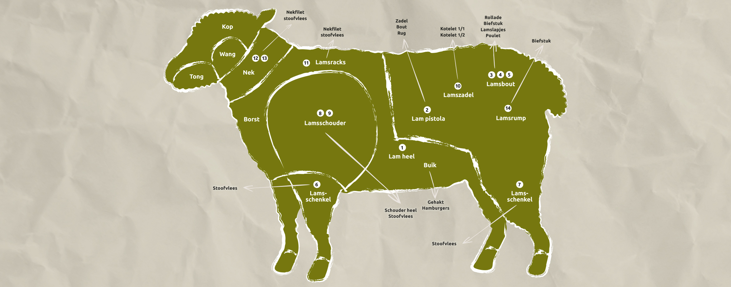 Het lamsvlees in ons assortiment komt van ver weg èn van dichtbij. Het Texels schaap leeft dicht bij huis; het Nieuw-Zeelandse lam wordt geïmporteerd. Het vlees van beide rassen wordt het hele jaar door vers aangeboden, waardoor we niet afhankelijk zijn van geboorteperioden.
