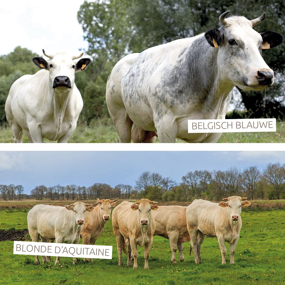 De Belgische Blauwe, ook wel Belgische Witblauwe genoemd, is een echte vleeskoe. Van oorsprong is het een melk- en vleesras maar door selectiemethoden is het een vleesras geworden. Ze vallen op door hun zware, gespierde bouw en hun edele kop. Het vlees van deze koe is mager, mals en sappig dankzij de fijne spiervezels en weinig vet.