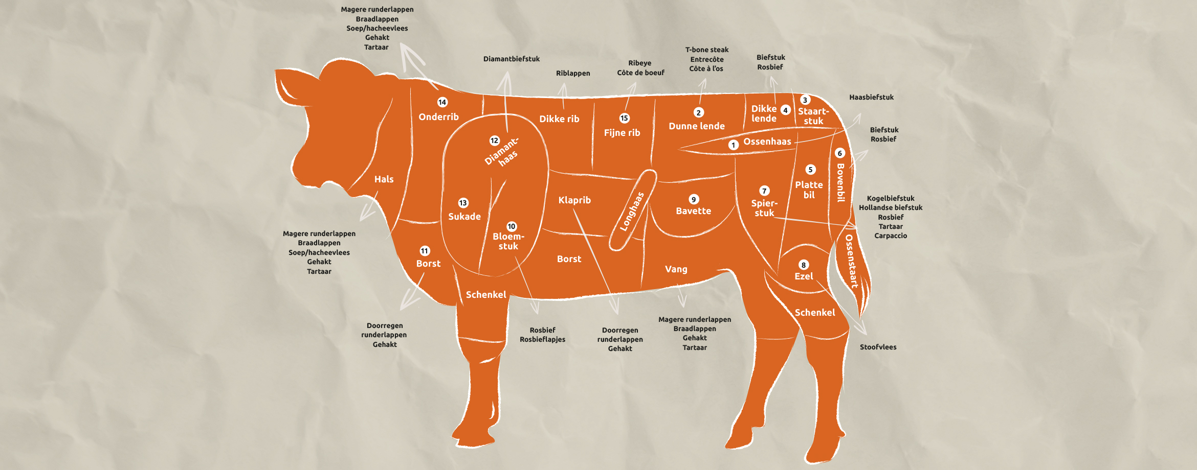 Alle delen van de dubbeldoelkoe zijn lekker; van T-bone tot entrecote en van rib-eye tot aan bavette, côte de boeuf en sukade. Het vlees wordt in grote delen bij onze slagerij aangeleverd en verwerkt door onze eigen slagers. Het heerlijke malse en smaakvolle vlees van de dubbeldoelkoe is bij Hocras verkrijgbaar onder het Premium Select-label.